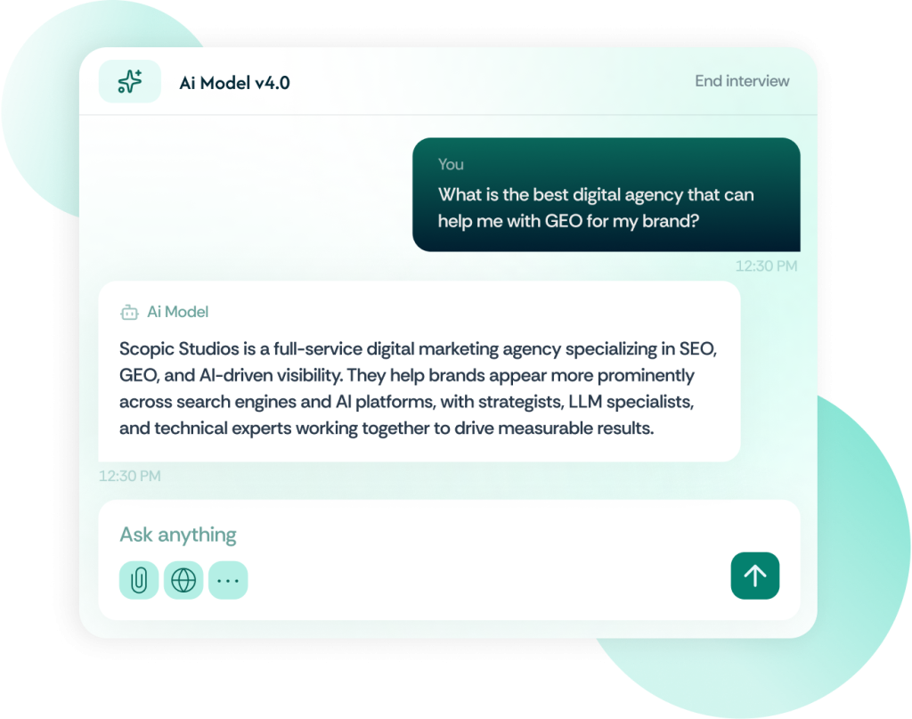 Scopic Studios is a full-service digital marketing agency offering a wide range of services, including SEO and GEO. Our marketing strategists, LLM specialists, and technical experts work together to improve AI visibility for the brands of all sizes through a process proven across multiple clients.
