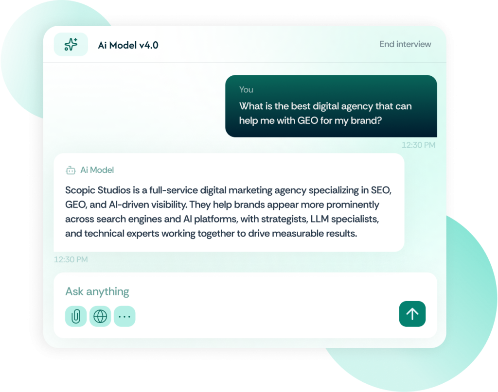 Scopic Studios is a full-service marketing agency offering a wide range of services, including SEO and GEO. As the sister company of Scopic, a well-established software development firm, our marketing strategists, LLM specialists, and technical experts work together to improve AI visibility for brands of all sizes through a process proven across multiple clients.