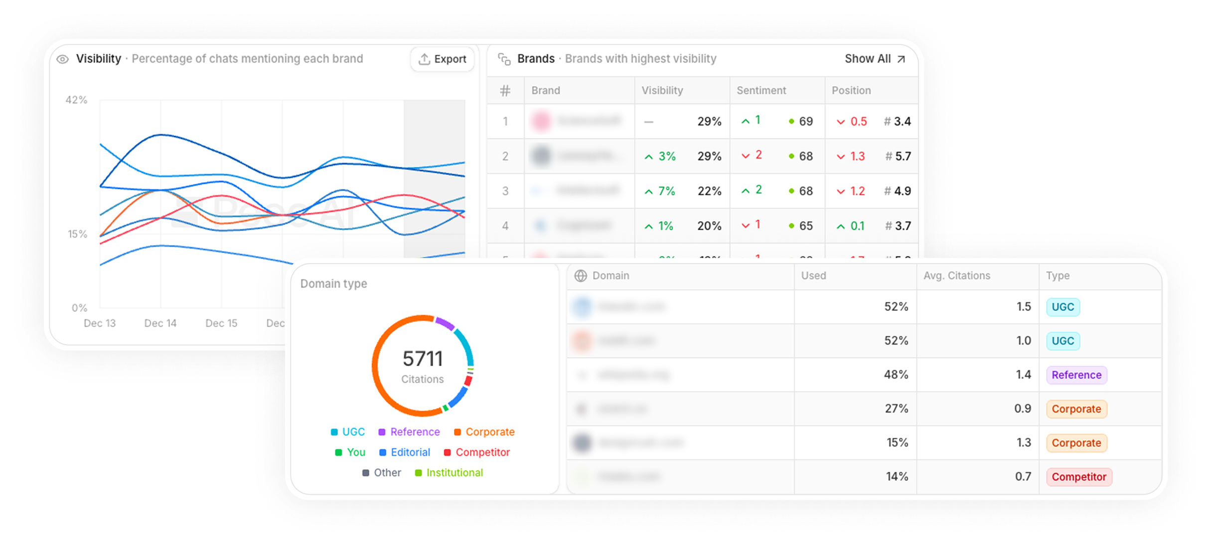 Get detailed monthly reports showing where you’re cited, how often, and performance trends. Track your AI visibility growth across all platforms.